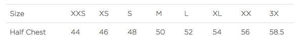 | Half Chest (cm) | 44 | 46 | 48 | 50 | 52 | 54 | 56 | 58.5 |